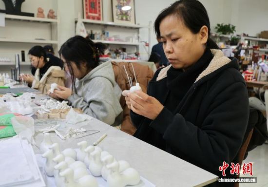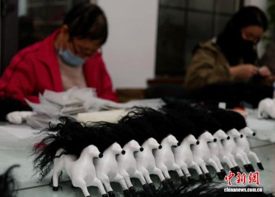 2月4日,在山東淄博小蝦米軟陶藝術(shù)研究院,工作人員正在描畫馬嘴。農(nóng)歷馬年前夕,從齊白石奔馬圖《如此千里》中“躍”出的“馬彪彪”,以潦草不羈的形象切中年輕人情緒密碼,成為爆款文創(chuàng)。其采用淄博泥塑工藝制作,分塑形、烤制、加毛發(fā)等10余道工序。趙曉 攝