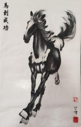 牛玉葉創(chuàng)作繡制的《馬到成功》。趙曉宇 攝
