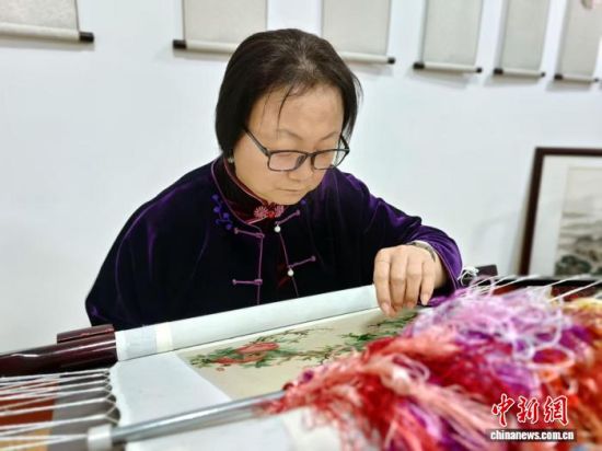 中新網(wǎng)泰安2月10日電 (梁犇 孫倩)春節(jié)將至,山東泰安新泰市“魯繡工坊”產(chǎn)業(yè)園區(qū)內(nèi),山東省省級(jí)非物質(zhì)文化遺產(chǎn)代表性項(xiàng)目中式服裝制作技藝(玉氏鴻葉旗袍制作技藝)代表性傳承人牛玉葉,正俯身于一幅即將收針的《馬到成功》刺繡作品前,為迎接農(nóng)歷馬年做最后趕工。纖如發(fā)絲的黑色繡線在潔白魯錦上往復(fù)穿引,漸漸躍出一匹昂首奔騰的駿馬。