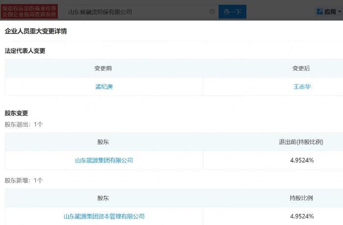 企查查顯示,日前,山東能源集團(tuán)有限公司(下稱“山東能源集團(tuán)”)退出山東省融資擔(dān)保有限公司(下稱“山東融擔(dān)”),退出前持股比例為4.95%。該部分股權(quán)由山東能源集團(tuán)旗下全資子公司山東能源集團(tuán)資本管理有限公司(下稱“山能資本”)“接手”。