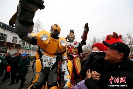 圖為書(shū)會(huì)現(xiàn)場(chǎng)“大黃蜂”和“齊天大圣”與民眾互動(dòng)。中新社記者 梁犇 攝