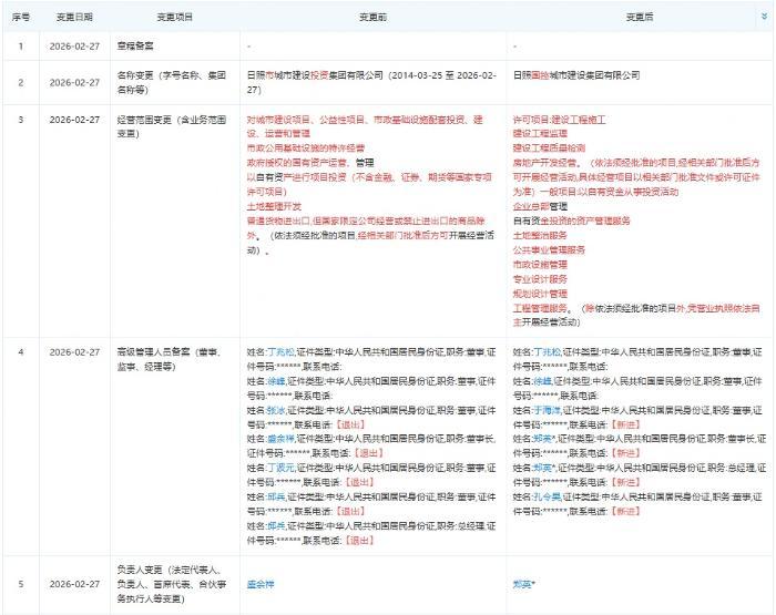 該公司名稱(chēng)變更為日照國(guó)控城市建設(shè)集團(tuán)有限公司,經(jīng)營(yíng)范圍從原有的“對(duì)城市建設(shè)項(xiàng)目、公益性項(xiàng)目、市政基礎(chǔ)設(shè)施配套投資、建設(shè)、運(yùn)營(yíng)和管理;市政公用基礎(chǔ)設(shè)施的特許經(jīng)營(yíng);政府授權(quán)的國(guó)有資產(chǎn)運(yùn)營(yíng)、管理”等表述,變更為“建設(shè)工程施工;建設(shè)工程監(jiān)理;建設(shè)工程質(zhì)量檢測(cè);房地產(chǎn)開(kāi)發(fā)經(jīng)營(yíng)”等。