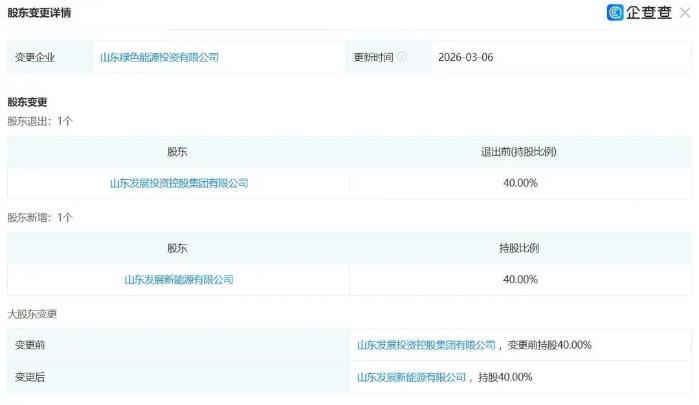 企查查顯示,山東綠色能源投資有限公司(下稱“山東綠色能源投資”)大股東發(fā)生變更,原持股比例40%的山東發(fā)展投資控股集團(tuán)有限公司(下稱“山東發(fā)展集團(tuán)”)退出,其全資子公司山東發(fā)展新能源有限公司新增入股,持股比例40%。