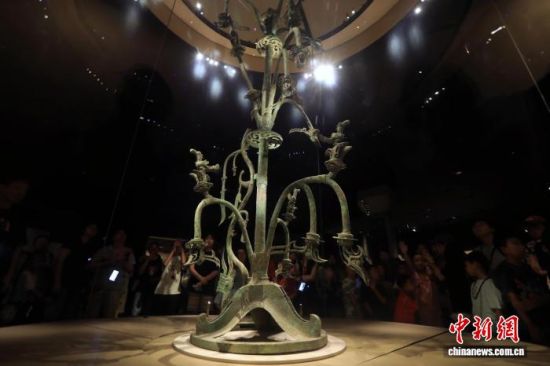 三星堆遺址出土的1號(hào)青銅神樹(shù)。(資料圖) 中新社記者 王磊 攝