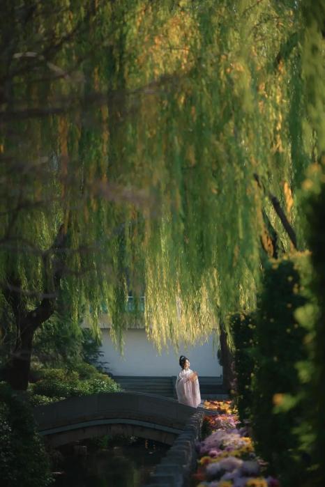 這里人少境幽,月洞門框景、曲廊延伸、臨水亭臺,每一處都契合中式美學(xué),溫婉漢服映著花海亭臺,人在園中,園在畫中,安靜高級,展現(xiàn)古風(fēng)寫真的極致韻味。