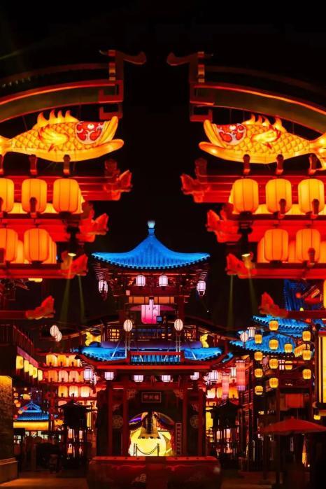 汴京盛景,燈火重燃。新大宋不夜城復(fù)刻了《清明上河圖》的繁華,高大城樓、華麗廊亭與漫天燈火相映,沉浸式演藝點(diǎn)綴其間。