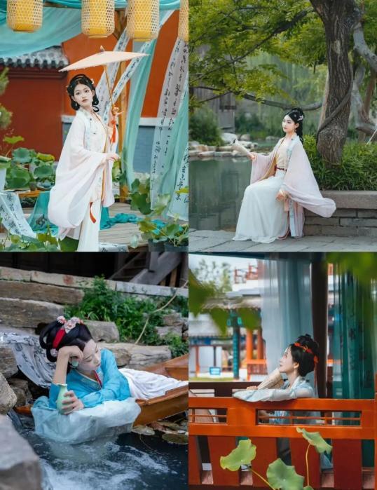 素雅漢服襯著玉色水花,觀瀾亭前的側(cè)影靈動仙氣,李清照紀(jì)念堂的紅柱回廊間,明制漢服與文人風(fēng)雅相融,四季皆景,張張皆是工筆國畫質(zhì)感。