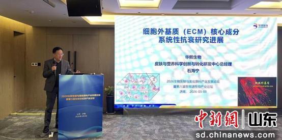 華熙生物皮膚與營養(yǎng)科學(xué)創(chuàng)新與轉(zhuǎn)化研發(fā)中心總經(jīng)理石海寧教授分享了細(xì)胞外基質(zhì)(ECM)核心成分系統(tǒng)性抗衰研究進(jìn)展。他介紹,ECM作為第十三大衰老標(biāo)志物,與免疫系統(tǒng)調(diào)控、DNA修復(fù)與細(xì)胞自噬、端粒削減延緩都存在密切的關(guān)系。