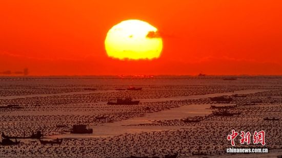 山東榮成:漁民迎朝陽(yáng)開展海帶養(yǎng)殖作業(yè)