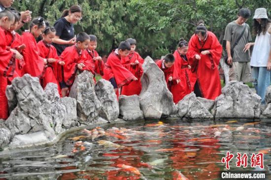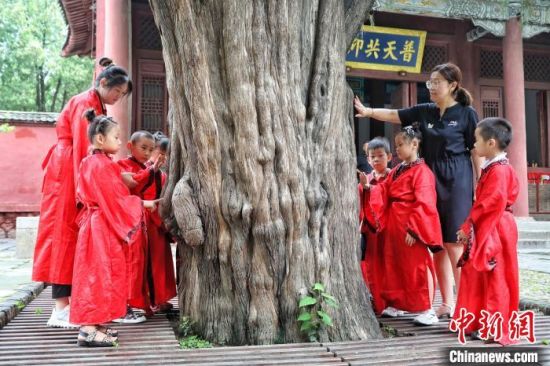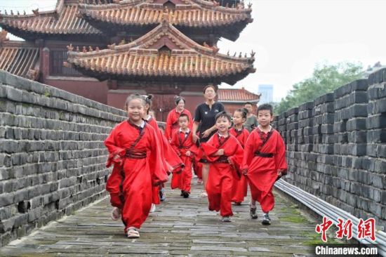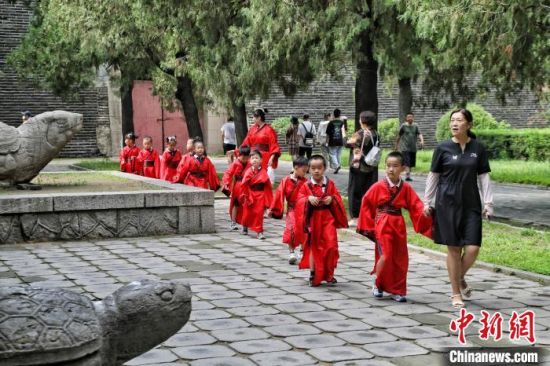 8月2日,山東泰安,小朋友身著漢服在泰山腳下的岱廟中樂享暑期研學(xué)游。當(dāng)天,泰山區(qū)岱廟街道幼兒園組織小朋友游岱廟、尋古跡,了解中國傳統(tǒng)文化,樂享實(shí)景沉浸式研學(xué)游。