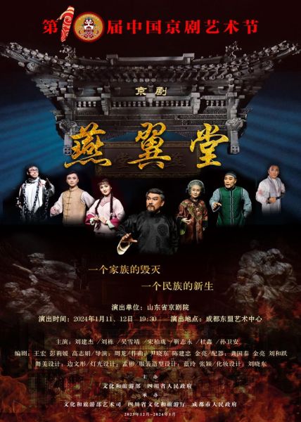 由文化和旅游部、四川省人民政府共同主辦的第十屆中國京劇藝術節(jié)于2023年12月15日至2024年1月21日在四川成都舉行。本屆京劇藝術節(jié)以“京劇藝術的盛會,人民群眾的節(jié)日”為主題,山東省京劇院創(chuàng)排的京劇《燕翼堂》作為入選劇目,將于1月11日、12日晚19:30在成都東盟藝術中心上演。