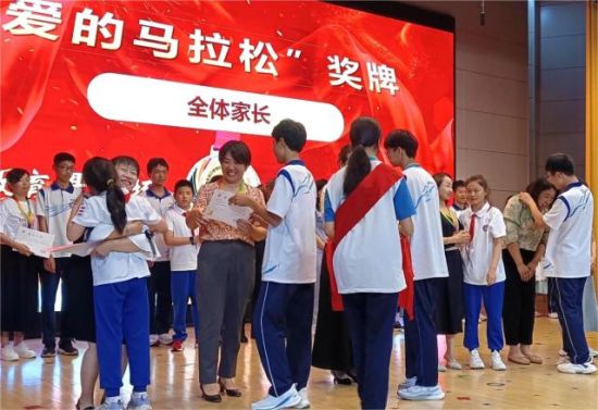 在該訓(xùn)練營(yíng)結(jié)營(yíng)典禮上,滄口學(xué)校通過積分排行和家長(zhǎng)投票相結(jié)合的方式,評(píng)選出了七個(gè)單人獎(jiǎng)項(xiàng)和最具人氣小組團(tuán)體獎(jiǎng)項(xiàng),優(yōu)秀家長(zhǎng)得到了隆重的結(jié)營(yíng)表彰。典禮最后,所有家長(zhǎng)依次上臺(tái),接受了孩子頒發(fā)的“愛的馬拉松”獎(jiǎng)牌和結(jié)營(yíng)證書。(完)