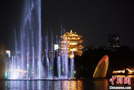 濟南大明湖上演燈光噴泉秀,與遠處的超然樓遙相呼應,美如畫卷。王采怡 攝