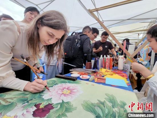 圖為外國學(xué)生在文創(chuàng)市集上為牡丹畫上色。中新社記者 趙曉 攝