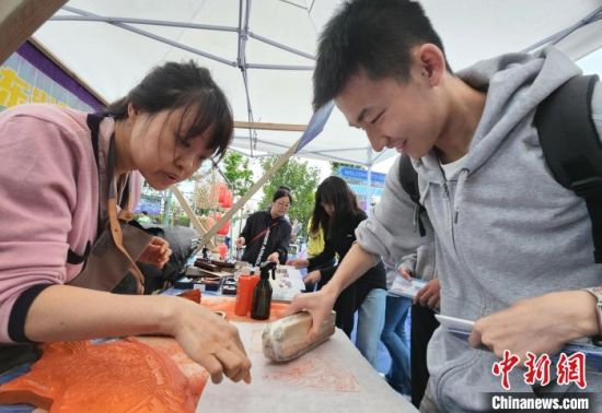 圖為學(xué)生在文創(chuàng)市集上體驗雕版印刷。中新社記者 趙曉 攝