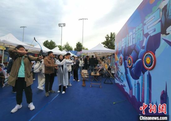 圖為學(xué)生在現(xiàn)場參與射箭互動游戲。中新社記者 趙曉 攝