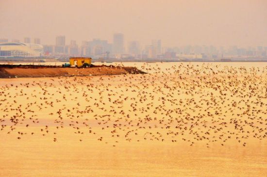 寒冬時節(jié),在山東省青島市城陽區(qū)河套街道大沽河口濱海濕地,數(shù)以萬計的越冬候鳥趁著晚潮巡游漫舞,棲息覓食,繪就一幅冬日里的生態(tài)畫卷。
