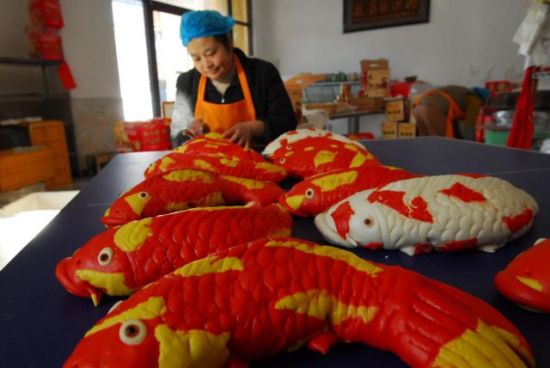 山東省青島市即墨區(qū)龍泉街道汪河水北村的村民將制做好的花饃裝箱外銷。張濤 攝