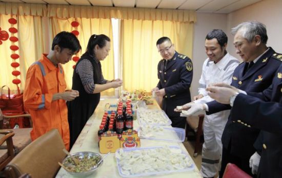 中新網(wǎng)山東新聞1月26日電(張孝鵬 馬桂山)“餃子真是太好吃了!”1月22日,在青島董家口港的圣瑪力諾籍油輪“海天”輪上,餐廳里傳來了歡聲笑語,24名中外船員一邊吃著熱氣騰騰的餃子,一邊贊不絕口。當(dāng)天是農(nóng)歷小年,董家口海事局聯(lián)合青島市職工國際交流服務(wù)中心、董家口出入境邊防檢查站等單位共同組織“中外船員慶小年”活動(dòng)。
