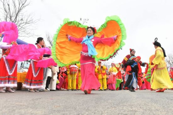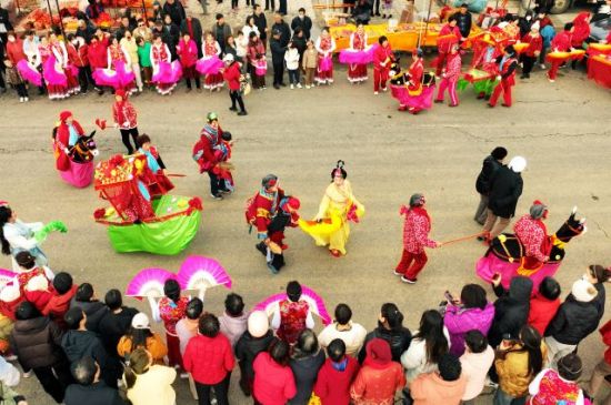 3月1日,居民在山東省青島市城陽區(qū)紅島街道高家社區(qū)市集上表演“劃旱船”。王海濱 攝