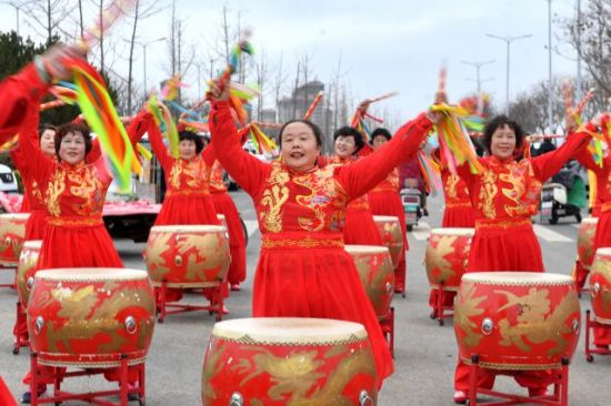 3月1日,居民在山東省青島市城陽區(qū)紅島街道高家社區(qū)市集上表演鼓舞。王海濱 攝