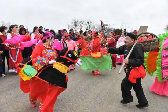 3月1日,居民在山東省青島市城陽區(qū)紅島街道高家社區(qū)市集上表演傳統(tǒng)“騎毛驢”節(jié)目。王海濱 攝