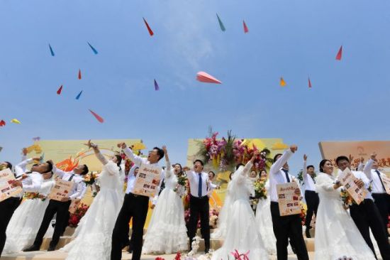 中共青島市委宣傳部、中共市北區(qū)委宣傳部等部門日前在青島濱海國際中心文明實踐廣場,為來自教育、金融、科技等不同行業(yè)的28對新人舉行新時代集體婚禮。新人們在親友的見證下交換信物、簽訂婚書,完成一場簡約而時尚的集體婚禮。