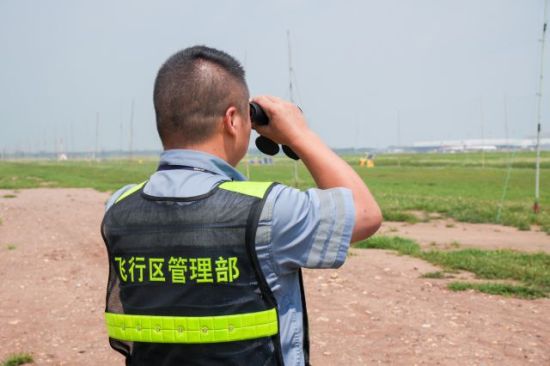 驅(qū)鳥員在跑道起降端進(jìn)行鳥情監(jiān)測。(青島機(jī)場供圖)